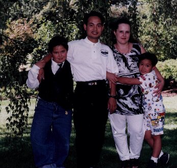 As you can see, I have the most perfect family. These three handsome guys with me are the most important men in my life. So all you men from the Dungeon take a number. LMAOROTF giggle,giggle. The first good looking guy is my oldest Anthony John, he is 10. I know what you are thinking. How can a 18 year old have a 10 year old son. Giggle, Giggle. The next guy is Paul my hubby of 12 years, I know ....what am I doing marring such dirty old man. Giggle, Giggle. That little sweetheart beside me is my son, Mitchell Wesley who is 7 years old. And watch out!!!!!! ladies he is the future heart throb of the Dungeon. So ladies lock up your daughters.*big smiles* | This is my number 1 bratt, hubby,moi and number two bratt. | ||||||||||||||||